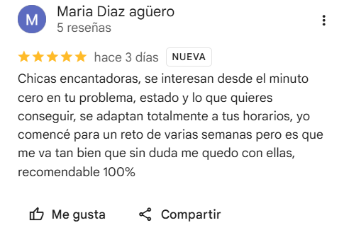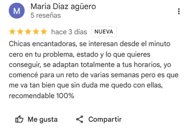 El entrenamiento se adapta muy bien a lo que iba buscando. Además, mi entrenadora es cercana pero profesional y resuelve cualquier tipo de duda que me surge.